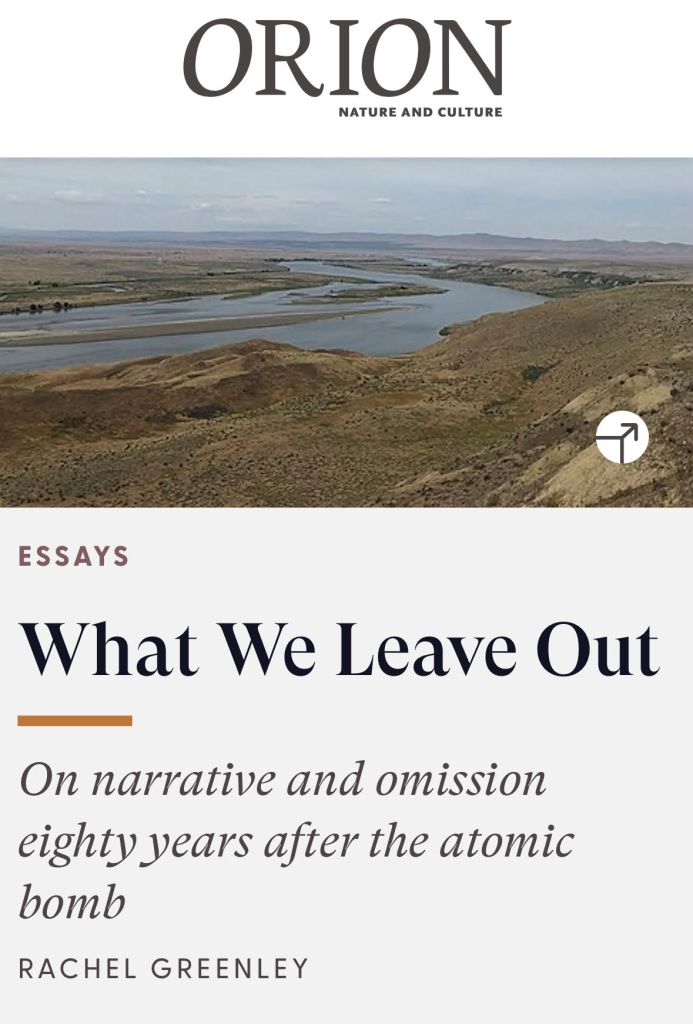 RACHEL GREENLEY is a Pacific Northwest writer published in the New England Review, The New York Times, Orion Magazine, River Teeth, Hobart, Brevity, and The Baltimore Review, among others. She has been supported by the Bread Loaf Environmental Conference and the Prospect Street Writers House. Her essay, “Here in Umatilla,” was nominated for the John Burroughs Award and was selected as a Notable Essay in the 2025 edition of The Best American Essays, guest edited by Jia Tolentino. Her essay, “The Atomic Disease,” was selected as Longreads Top Essay of the Week.